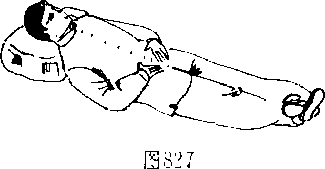 1 .躺卧于软席或床上,身体平躺,不可歪斜(图827八全 身放松,身体各部位要点可参前述,两手轻轻放于腹部,掌心 向下,掌指相对,两中指轻轻相接,放F'丹田”处口两脚靠拢, 并右足放于左足下,两足相交,足心朝前,足尖向两侧外撒口闭 眼,呼吸白然,意守?丹田",待全身放松宁静后便可运气行小 循环功,,