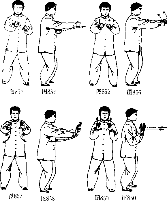 11 身体不动.两手立掌慢慢拉收至胸前,掌心仍朝前口意 想双掌附着天然大气收拉而向.(图859、860)