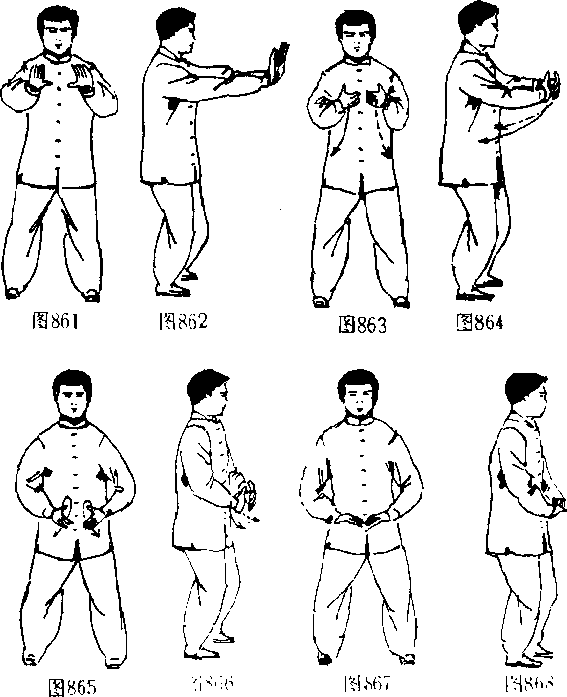 12 .微方:奂气.同时把“玉津”(唾液)随存气叩一向下吞送至 丹田口此亦为“炼丹工随后再双掌向前徐徐推出.方法同前. (图 861.862)