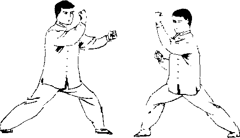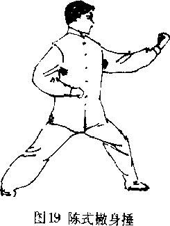孙式:?般无“撇身捶”之说,只在“践梦打捶”后,起身 向上行一撇身打捶的过渡动作,虽不能完仝称为科撇身捶,但 其在技击上也有“撇身撵”的打击效果,