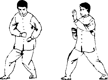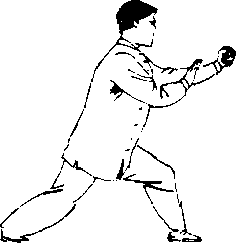 杨 式:左手由上向下1由外向内“按”化,右拳随身体右 转向右前,下方撒击,后收于腰侧;左手经胸前向上方经右手