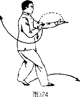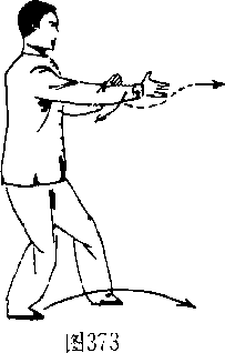 (D左脚向前迈?步,右手变掌,掌心向匕掌指朝前从左 手臂下向前方穿伸出,左手附于右手臂上(图373)。匕动不 停,右足向前迈?步,左手掌(掌心向上、掌指朝前)也从右手 臂下向前穿伸出,右手略收,翻掌附于左手臂上.眼看左掌。 (图 374)