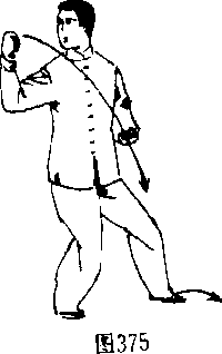 (2)左脚再句前匕一步,足尖里扣;同时左手内旋变拳向 下拉回至左胯旁口右手外旋变拳向后、向上再向正前方划弧, 经前额向左内足踝部打下。身体随着卜.沉,左腿屈膝,右腿微 弓,眼看右拳,(图375、376)