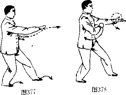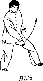 (1)身体正直,咯向左转,重心后坐,同时右手沉肩松臂向 上提起+拳心向下,左拳变掌卜”按干隈间.(图377)