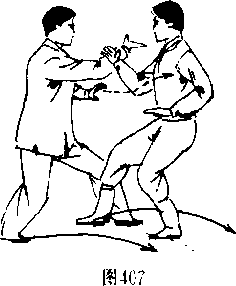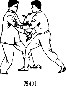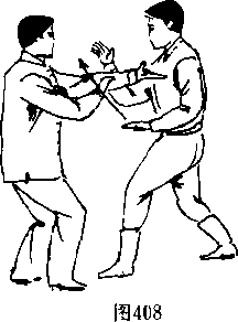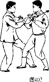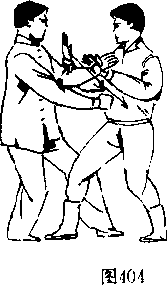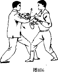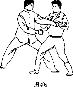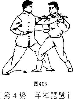 甲方在按化乙手后,进而又以“挤”劲粘乙手逼迫,又左手 外庭,变为“棚”劲拥击乙方;乙方回双手向上拦阻.(图ML 402)「第3势的不看捶」甲方左手棚劲向左加劲.遥压乙方,同时右足跟步,以“肘 卜看捶”式右拳从左手下直接樽方乙方腹部二(图403,404)乙方迅速双手向左下侧再握化甲左手臂,右掌切在甲方 左肘处向右“大将气图405).甲方左臂沉肩垂对,左手带着乙手向左拨而拉开,右掌从中向前穿击乙胸,以便又可化解,随 后甲左手收回变掌顺右手F再向前穿出乙胸.此为“手挥琵 琶”式口(图4。6、4。7制{溶)