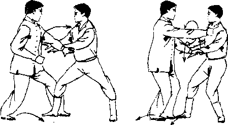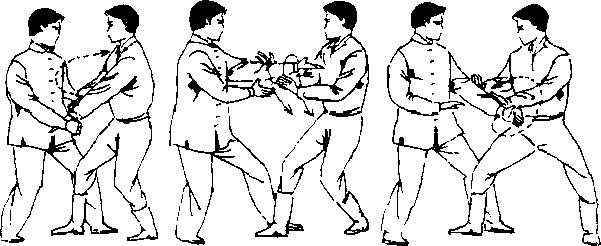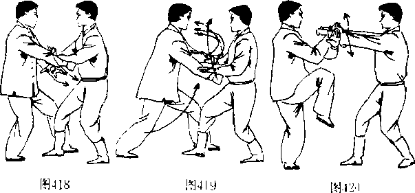 甲于(图413),甲方左掌内旋绕过乙手从中前穿插乙胸,乙方 也迅速收回双手粘而拦住甲左掌,并向左下方掘化.(图414、 415)