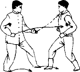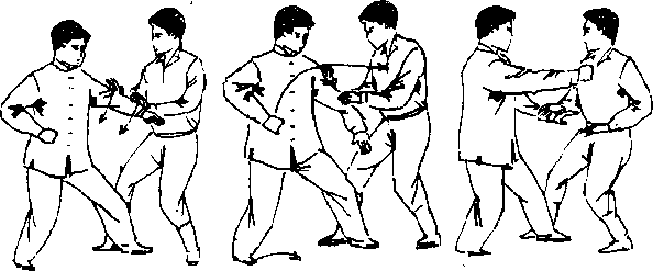 乙方受击,其必他双手向上拦截,并向下方“按”劲掘而按 化.甲方身体右转并下沉,避而粘带,乙双手下沉,乂立即右拳 随身体左转、右足跟步而向前捶击乙方胸部口(图449、450、 451)
