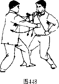 甲左乙右(图447\甲方先以“时卜看捶”式主动攻击,乘 乙方还未立拳时,迅速左足上步.右足跟步,出左手以“JT劲 向前上方棚击乙方头部和胸任,右手握拳从左手下向前捶击 乙方腹部口使乙方还未出手便已受损。(图448)