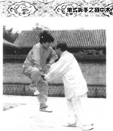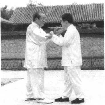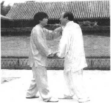 S 273 .两手环抱气球粘着对方双 手,先以意将气球微微压瘪,使内气 进入胸中,继而神意气一定,内气的 传导似通电般自胸中沿身中垂直线S 28下行人地,即由身前通向双手,将对 方搠出(图27、28)。此为揽雀尾之搠 势用法。图29