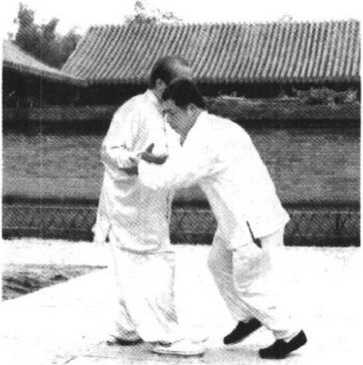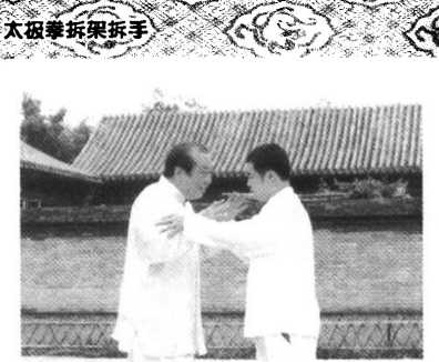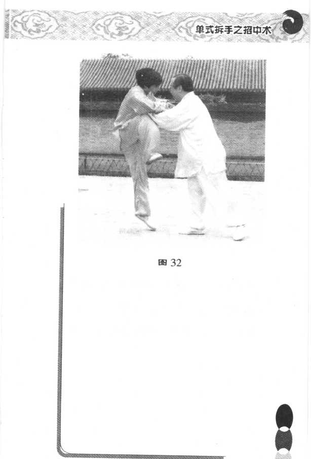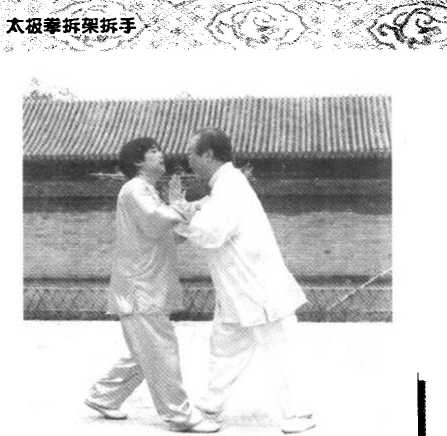 4 .对方双掌搠接我两前臂时, 先以手领出肘内劲挤向对方背后之 劲源(图29)OEB 30继而以两前臂沾带对方的双掌, 随着两肘端展搦而将对方捋向胸前, 此时配合着腰圈右旋,将对方捋向我 之右方(图30)。此为揽雀尾之捋势用 法。BB 315.倘若对方未被捋回时,两掌 立即合向胸前,左掌贴右掌根,劲起 于足下,转而升腾至胸前,使手、足之 内劲上下相随地整体向前催发,将对 方挤出(图31、32)。此为揽雀尾之挤 势用法。BB 33