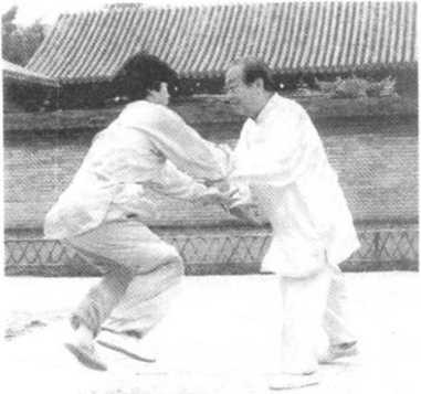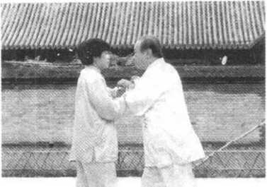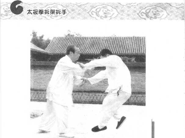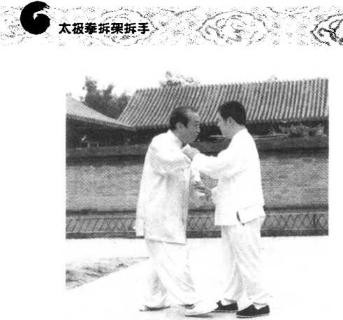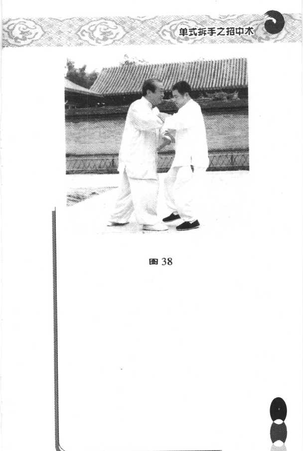 扶贴在我的两前臂上,意气要先向内 合,随即神意气暂短的一定,再开向 对方背后,将其搠出。(图35、36)