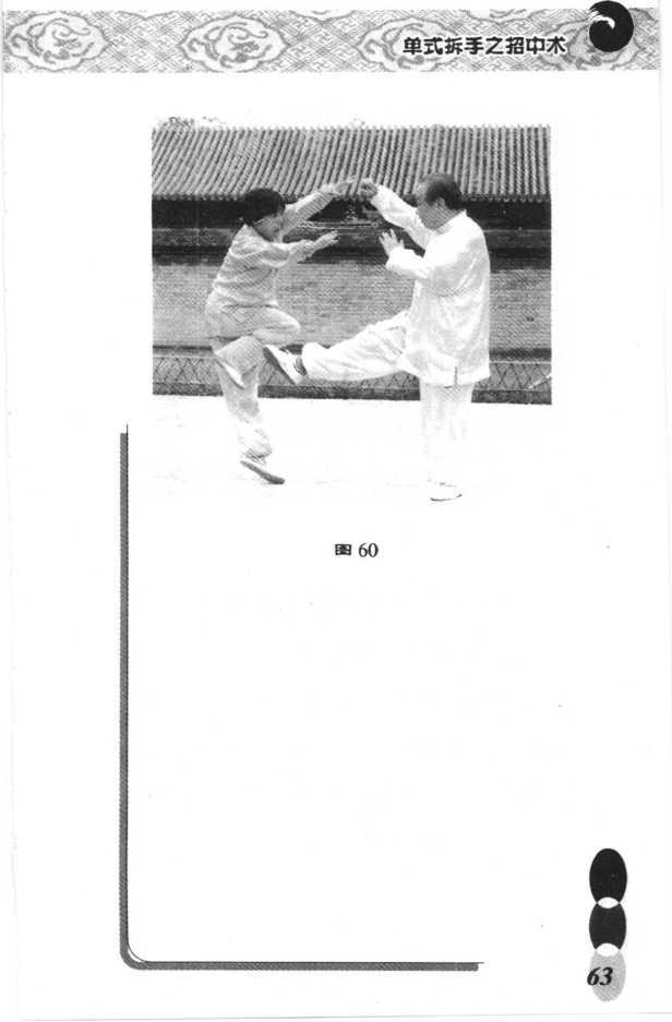 1.当对方将我之双手按至胸前 时(图57),立即运用“如封似闭”式 中的''阴阳转换恍如山”的劲法,双手 背在擎接来力的同时找出对方来力 之手的一个劲点,以劲点之边粘其双BH 58手,同时身背后倚,两肘随势而张 展。两前臂随着通出旋绕裹捋之内劲 而向上穿伸。(图58)BB 592.心中一静,内气下沉,在对方 毫无察觉下提起右腿,随即用右脚外 侧贴向对方右胯;在两掌心通出搠按 挤内劲的同时,右脚向右前方分摆。 (图 59,60)9 61