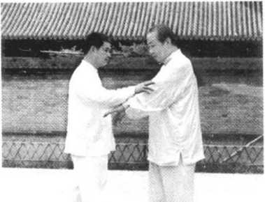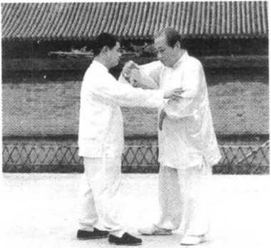 同时递肘而将双手腾出,两肘不 丢不顶地通过接触点与对方双手相 沾粘,以察知和把握对方的意图,对 方在接触点感觉不到我之内劲的动 向便不敢妄动。(图1)