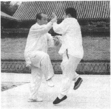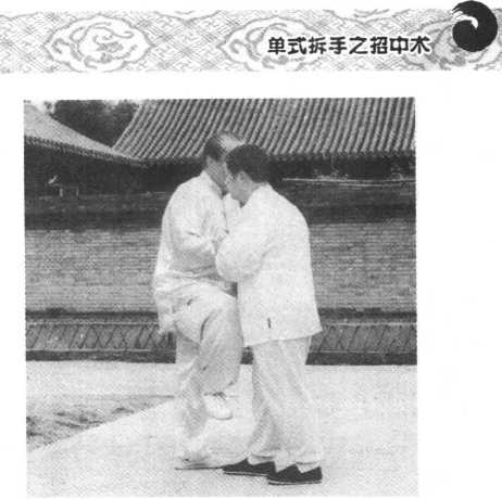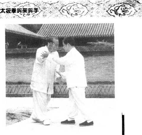 1 .当双手被对方踏按时(图 85),两手顺内气升腾之势外翻,同时图86右膝也随势上提。(图86)2 .内气贯通周身,右手在上穿的同时通出搠内劲,左手向前通出挤 内劲将对方发出。(图87、88)图88BB 8
