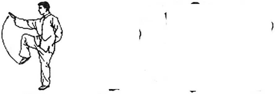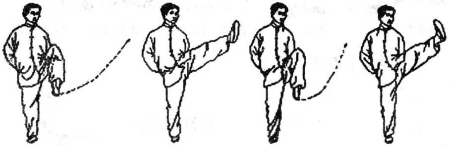 4. 摆莲脚——支撑腿微屈站稳。另一腿从异侧摆起经面前 外做扇形摆动,脚面展平,两手在额前依次迎拍脚面,击拍两响 (图 2 -4