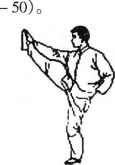 3. 拍脚一一支撑腿微屈站稳。另一腿向上直摆,脚面展平, 手掌在额前迎拍脚面(图2-47、图2 -48)。
