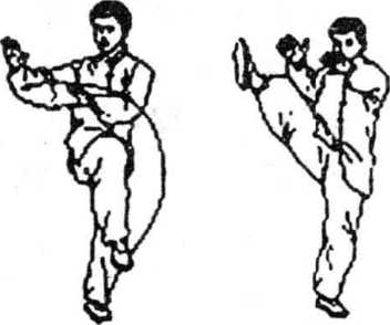 2. 蹬脚一一支撑腿微屈站稳,另一腿屈膝提起,然后慢慢 蹬出,腿伸直,脚尖上勾,脚高过腰部(图2-45.图2-46)。