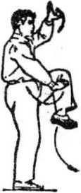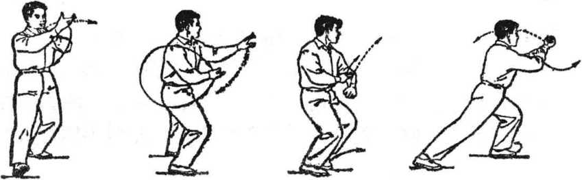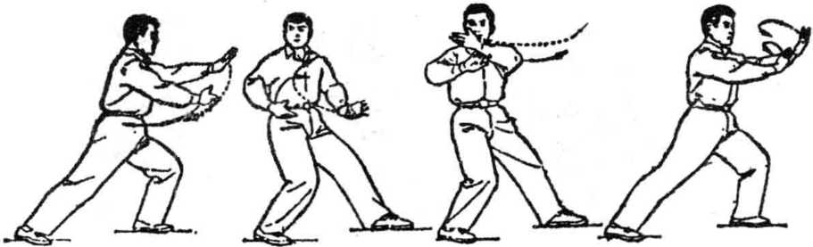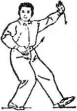 (1) 重心前移,右脚尖外展,左脚尖内扣,左腿微伸直,同 时右拳略向上挑,左拳稍向下落,两拳拳眼仍向上。眼向前看 (图4- 1皿)。