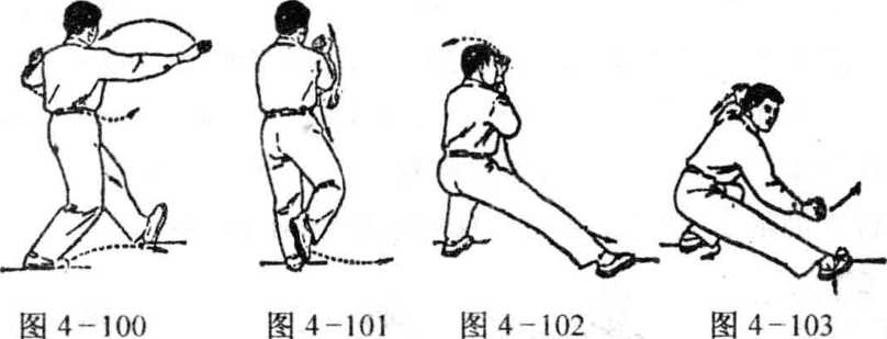 (3) 右臂掩肘下落,左拳从右前臂外侧上穿;同时左腿屈 蹲,右脚向右侧(正东偏南约30。)伸出成右仆步。眼看右前方 (图 4-102)。