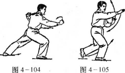 (4) 上体右转,右拳由体前沿右腿内侧向右前方穿出,左拳 向左后上方伸展,两拳拳眼均转向上。眼看右拳(图4-103)。