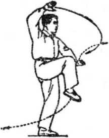 (2) 右腿蹬地,左脚提起,右拳变掌微内旋,左拳变掌下落 经腰侧向前向上方穿出,掌心向内。眼向前看(图4-105)。