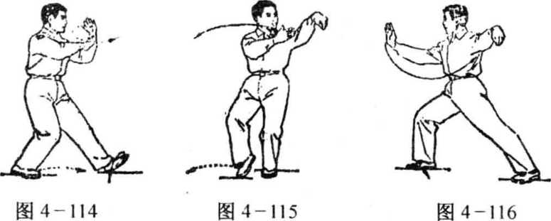 掌心转向上,右掌随之转动。眼看左掌(图4-114)o
