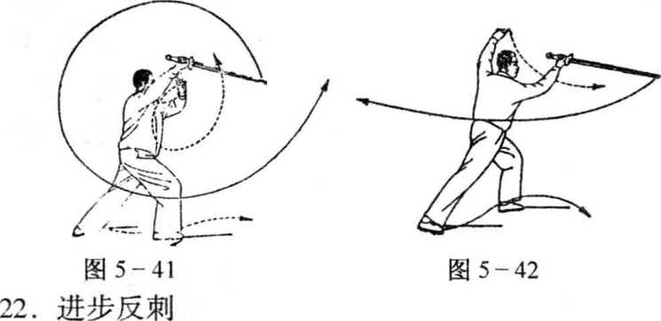(2) 身体左转,左脚前进一步,成左弓步,同时,右前臂向 上弯屈,剑尖向上挑挂,继而向前刺出(前臂内旋,手心向外, 成反立剑),力注剑尖,剑尖略低,左手剑指附于右腕部,眼看 剑尖(图5-44)。