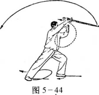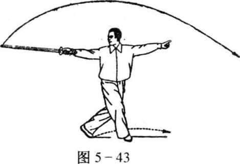 (1) 身体向右转,右脚向前横落盖步,脚尖外撇,左脚跟离 地成半坐盘势,同时,右手剑剑尖下落,左剑指下落到右腕部, 然后剑向后方立剑刺出,左剑指向前方指出,手心向下,两臂伸 平,右手手心向体前;眼看剑尖(图5-43)。