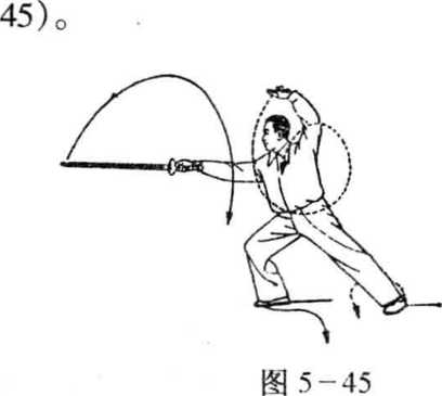 转体划弧上举向前下方点出,右臂平直,剑尖下垂,力注剑尖, 左剑指下落经身体左侧向上绕行,在体前与右手相合,附于右腕 部,眼看剑尖(图5-46)0
