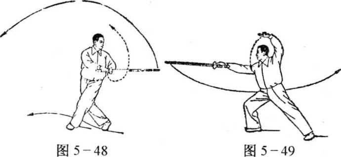 刃,左剑指则经左后方上绕至左额上方,手心斜向上;同时,右 脚前进一步,成右弓步,眼向前看剑尖(图5-49)。