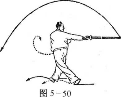 (1) 重心略后移,身体右转,右脚尖外撇,左脚跟离地成交 叉步,同时,右手剑由右侧下方向后反手撩平,左剑指落于右肩 前;眼向后看剑尖(图5-50)。.
