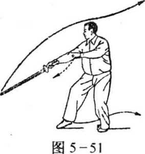 (2) 左脚向前垫一步,脚尖外撇,身体左转,随即右脚前进 一步,脚尖着地,成右虚步;与此同时,右手剑由右后翻臂上举 再向前劈下,剑尖与膝同高,力在剑刃;左剑指自右肩前下落经 体前向左上划圆再落于右前臂内侧;眼看前下方(图5-51)o