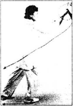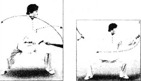 (2)抡臂叠拳:上体左转, 向左抡摆一周,右臂稍向下伸, 交叉相叠,右拳握扇压在上面。