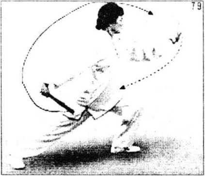 (1) 返身穿扇:身体微左移,右手持扇向上、向前抡至头 顶;再沿体侧向身后反手穿(图6-83)。