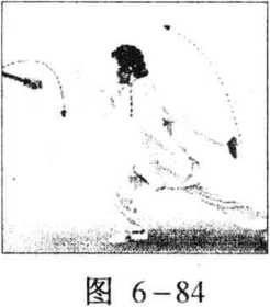 侧向身后反穿;再随转体向右前穿出;左手也随之向左后伸出, 头随体转,目视右扇(图6-84)。