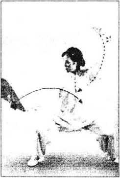 (2) 虚步拨扇;身体左转,左脚尖外撇,右脚向前(正东) 上步,脚前掌点地,成右虚步。左掌向上,向左划弧摆至头左上 方,指尖向右,掌心向外;右手握扇向下,向左拨扇,停于右膝 前上方。掌心向左,目视前下方(图6-92)。