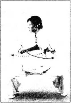 (1) 翻身绕扇:以两前脚掌碾地,上体挺胸展腹向右后翻 转。同时右手持扇随转体向上、向前绕摆至头前上方,再以腕关 节为轴持扇挽一个腕花。使扇在右腕外侧绕转一周。左掌指仍扶 于右腕部;目视前方(图6-81)0