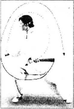 身体迅速反身向右后转,重心右移成右弓步。右手持扇沿体