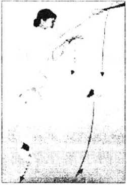 (2) 开扇挑掌与后举腿要协调一致。同时拧腰、挺胸、转 头,右腿屈膝后举,身体成反弓行。扇骨坚直,扇面向南。