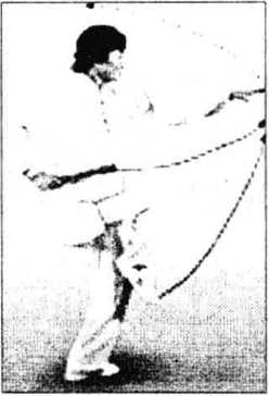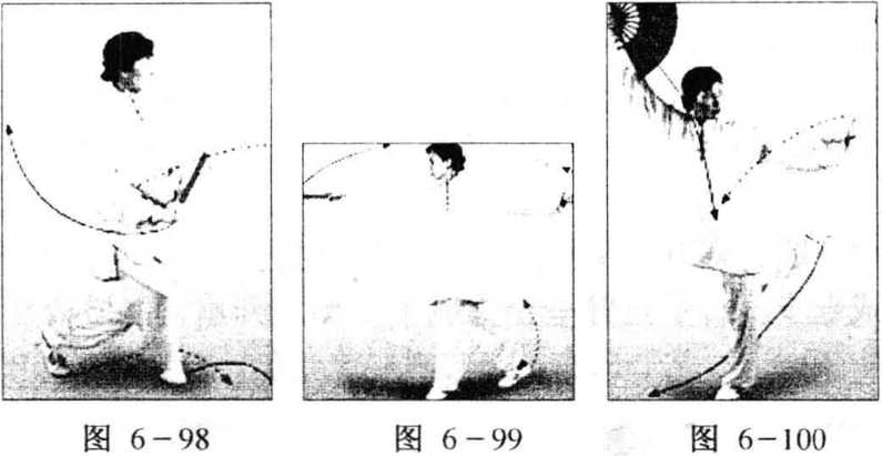 (2) 插步展臂:身体继续右转,左脚扣脚上步,右脚经左脚 后向左插步,重心移至左腿。两臂分别向左、向右展开,腕同肩 高。目视右扇(图6 - 99) o