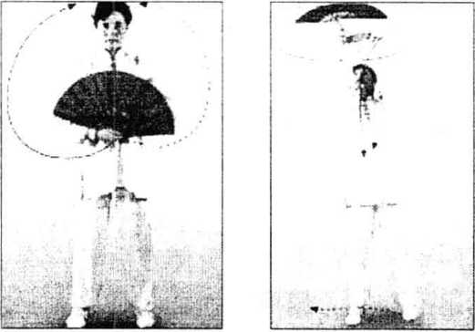 (2) 云扇时仰头挺胸,腕指要灵活。扇面在头上翻转平云,