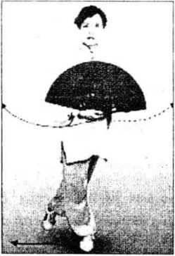 (3) 插步抱扇:左脚向右脚侧后方插步。右手持扇下落,抱