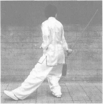 Turn the body to the right. Move the left foot forward, with the left toes pointing out. At the same time, hold the sword in the right hand, draw a circle and wind back, hold the sword straight up and down to the right of the body, the palm out. The left sword-fingers circle with the sword, and pull back in front of the right chest. Look at the sword tip. (Fig. 54)