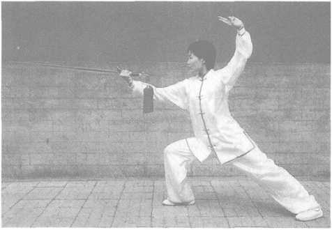 Turn the body to the left. Move the right foot a step forward, and shift the body center forward, forming a right bow stance. At the same time, holding the sword in the right hand, slice the sword upward backhand in a downward and then forward motion with the edges of the blade vertical, the palm facing out at shoulder height, the sword tip slightly lowered. Circle the left sword-fingers upward until they are above the left side of the head, the palm slanted up. Look straight ahead. (Fig. 55) Important Points
