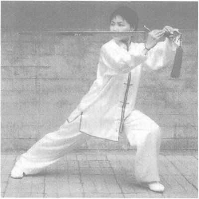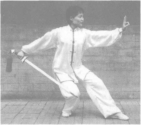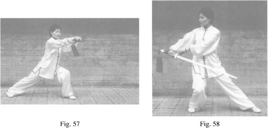 Shift the body center onto the right leg, and bend the right leg. At the same time, holding the sword in the right hand, draw the sword back beside the right hip, pulling back the left sword-fingers with the right hand. Look to the lower right. (Fig. 58)