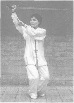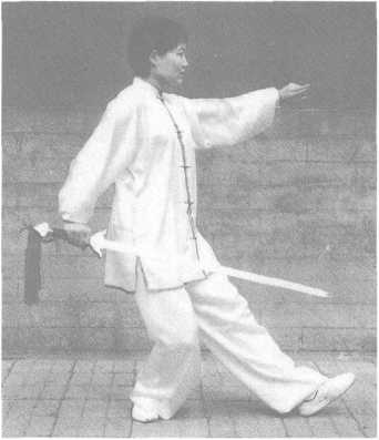 Move the left foot forward to the left front, heel first. Hold the sword in the right hand and continue to circle