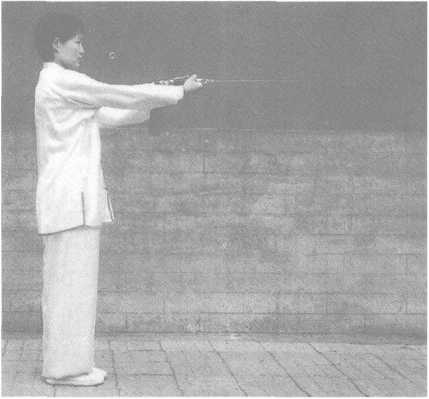 ? Be coordinated and consistent in stabbing and standing upright with feet together. After stabbing out the sword, bend the arms slightly, and relax and lower the shoulders.