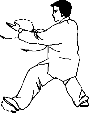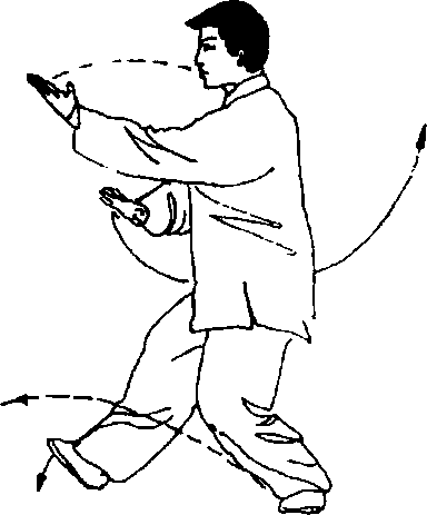 身体微左转,左脚向左前方 迈步,身体重心降低,体下沉成半 马步(左脚尖外撇,右脚尖正向 前);左臂内旋摆至身体左侧,向