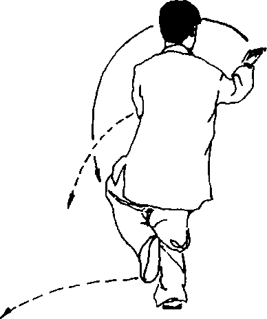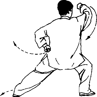 身体右转,左腿伸直,右腿屈 膝侧弓;右臂屈肘内旋上架于右 额前,拳心向外;左拳内旋向左后 方沿左腿后侧穿出;目视前方。 (图 4-158)