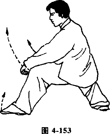 前靠出,左拳置于左膝前,拳心 向下,拳眼对膝;右掌经右耳侧 向左摆至左前臂内侧助力;目视 左前方。(图4-153)